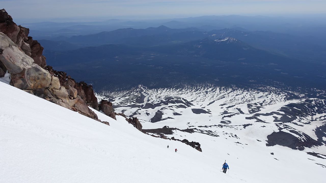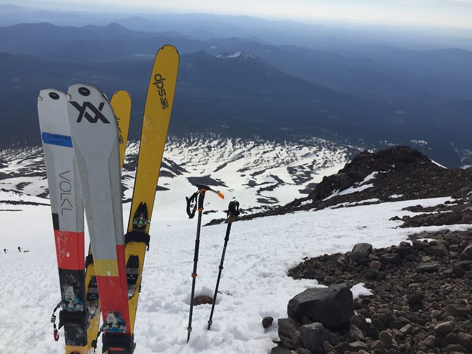 It was windy on top, 40+ mph. And there were a ton of people. 90% coming from Avalanche Gulch (a much more popular and easier to access route). We hung around and took photos for 15 mins before transitioning to downhill skiing. I regretted not taking the skins off my skis 1,500 feet below in mild wind. They could have sailed to the Pacific 60 miles away. Lesson learned. I didn’t do a great job putting my skins away or my boots in ski mode (liner tongues were off) but it was good enough for confident skiing.
