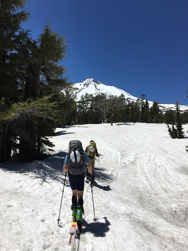 So we pulled off the road about a mile before the trailhead. Elevation was around 6,700 ft (actual trailhead is over 7,000 ft). Luckily, there was a snowy, shaded gully that would allow us to start skinning immediately. It was at least 70 degrees, so shorts and t-shirts were the outfit of choice. My farmer’s tan would later regret this.